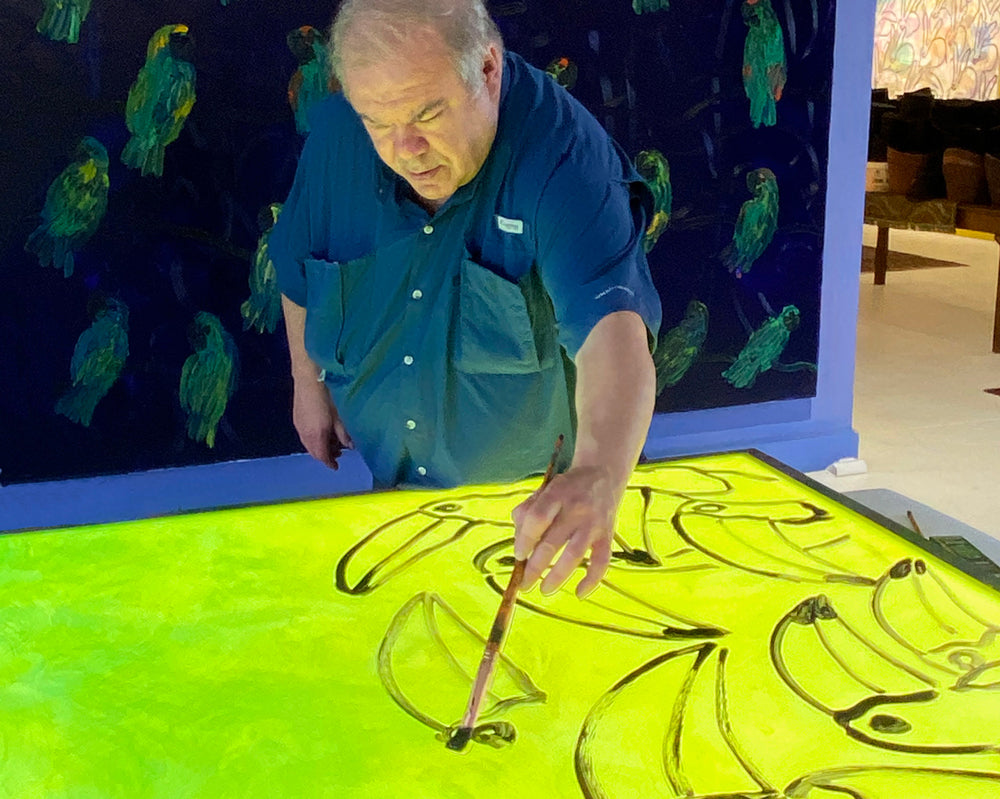 “Hunt Slonem is the kind of artist whose life becomes his art. Walking into his studio is like entering a magical world of a victorian-era mansion in the middle of a rainforest.”